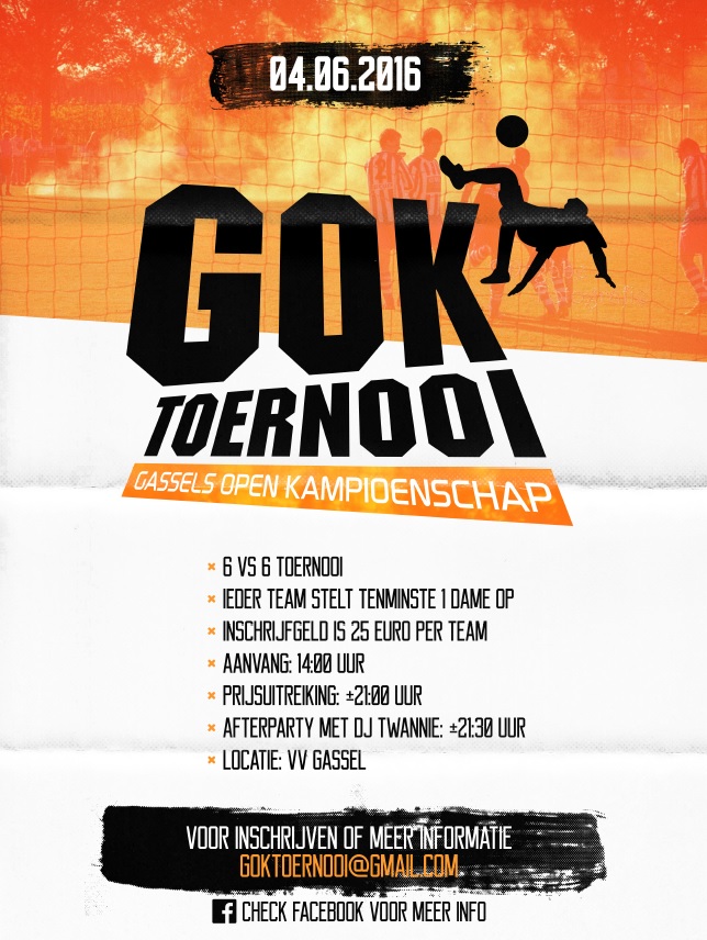 Zoals al eerder aangekondigd organiseert VV Gassel op zaterdag 04 juni 2016 weer het jaarlijkse GOK-toernooi. Meedoen aan de zevende editie van dit toernooi is nog steeds mogelijk. Het inschrijfgeld bedraagt slechts € 25 per team. Klik hier voor het inschrijfformulier. Ingevulde formulieren dienen voor 21 mei 2016 te worden gemaild naar goktoernooi@gmail.com of worden ingeleverd bij Niels Driessen of Frank ten Haaf. Ook bij deze editie is het zo dat ieder team altijd tenminste één dame heeft opgesteld. Het toernooi begint omstreeks 14:00 uur. De prijsuitreiking zal zijn rond de klok van 21:00 uur waarna vanaf 21:30 uur de afterparty met DJ Twannie begint in de kantine. Meer informatie over dit evenement is te vinden op de speciale Facebookpagina en op een speciale flyer.